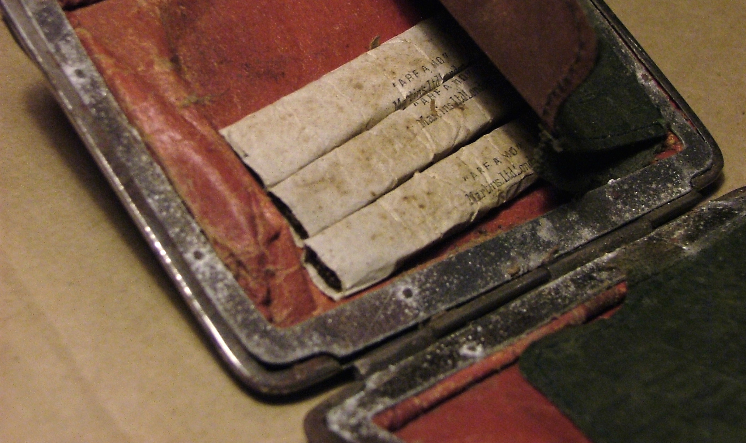 In March 1916 Joe received the balance of Ned’s pay owing to him: £5-14s-4d (£5.72). His personal effects were sent in a white cloth bag ─ perhaps an ammunition bag. They were itemised as 1 (identity) disc, 1 belt, 1 leather cigarette case, 1 pipe, 3 photos (in case), 1 notebook. The pipe was no longer there, but the other items were (and are now with the Regimental Museum). Of the three photos, one is badly deteriorated ─ male, unknown ─ one is George in uniform, and the third is a young woman. On the back she has written “To Dear Ted, with Love and best wishes from Annie”. This was perhaps Annie Lankester, another niece of Sutton Smith’s mother. She was born in nearby Otley in 1894, was thus a year younger than Ned, and in domestic service in Ipswich in 1911. Or was Annie a friend he had made in Brighton? Most poignant of all is to find in his cigarette case three “ARF A MO” cigarettes, made by Martins Ltd London, Ned’s last cigarettes which have remained undisturbed now for nearly a century.