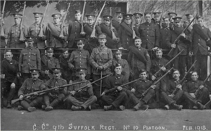 Ned’s first letter home was (like so many others he sent) undated, and in this case also unsigned. Dear Mother, Just a card to let you know I am in the Army and am at Ipswich. We tried all we could to get home tonight but we could not. My bike is at the Running Buck [a pub at St Margaret’s Green], I am going to see the landlord to send it home by Dunnett. Sutton is down here, Clark, Buckingham is gone. We are in a big school on the Rendem [Ranelagh] Road. I can’t send my address till we get settled. Will write a letter as soon as possible. We could not get away from the Barracks till 7 o’clock. I am in the Infantry. Ned was enlisted as 15176 Pte. E.L. Goodchild, 9th Battalion Suffolk Regt, which formed part of 71st Brigade, 24th Division in the Third New Army (K3). Whether the confusion was his or the army’s, in his first letters home Ned reported his Company in the 9th as successively F, D and B before he confirmed that he was a member of C Coy.