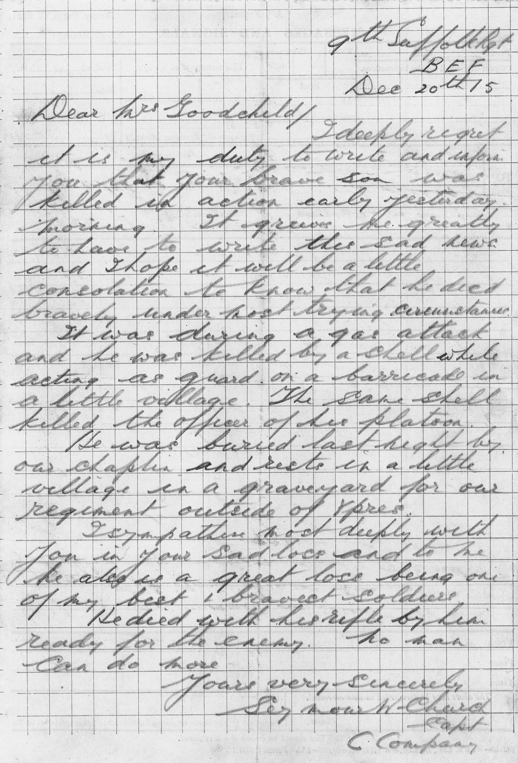 The commanding officer of C Company wrote to Ned’s mother on the day after his death: “Dear Mrs Goodchild, I deeply regret it is my duty to write and inform you that your brave son was killed in action early yesterday morning. It grieves me greatly to have to write the sad news, and I hope it will be a little consolation to know that he died bravely under most trying circumstances. It was during a gas attack and he was killed by a shell while acting as guard on a barricade in a little village. The same shell killed the officer of his platoon. He was buried last night by our chaplain and rests in a little village in a graveyard for our regiment outside of Ypres. I sympathise most deeply with you in your sad loss and to me he also is a great loss being one of my best and bravest soldiers. He died with his rifle by him ready for the enemy. No man can do more. Yours very sincerely, Seymour W. Church, Capt.”