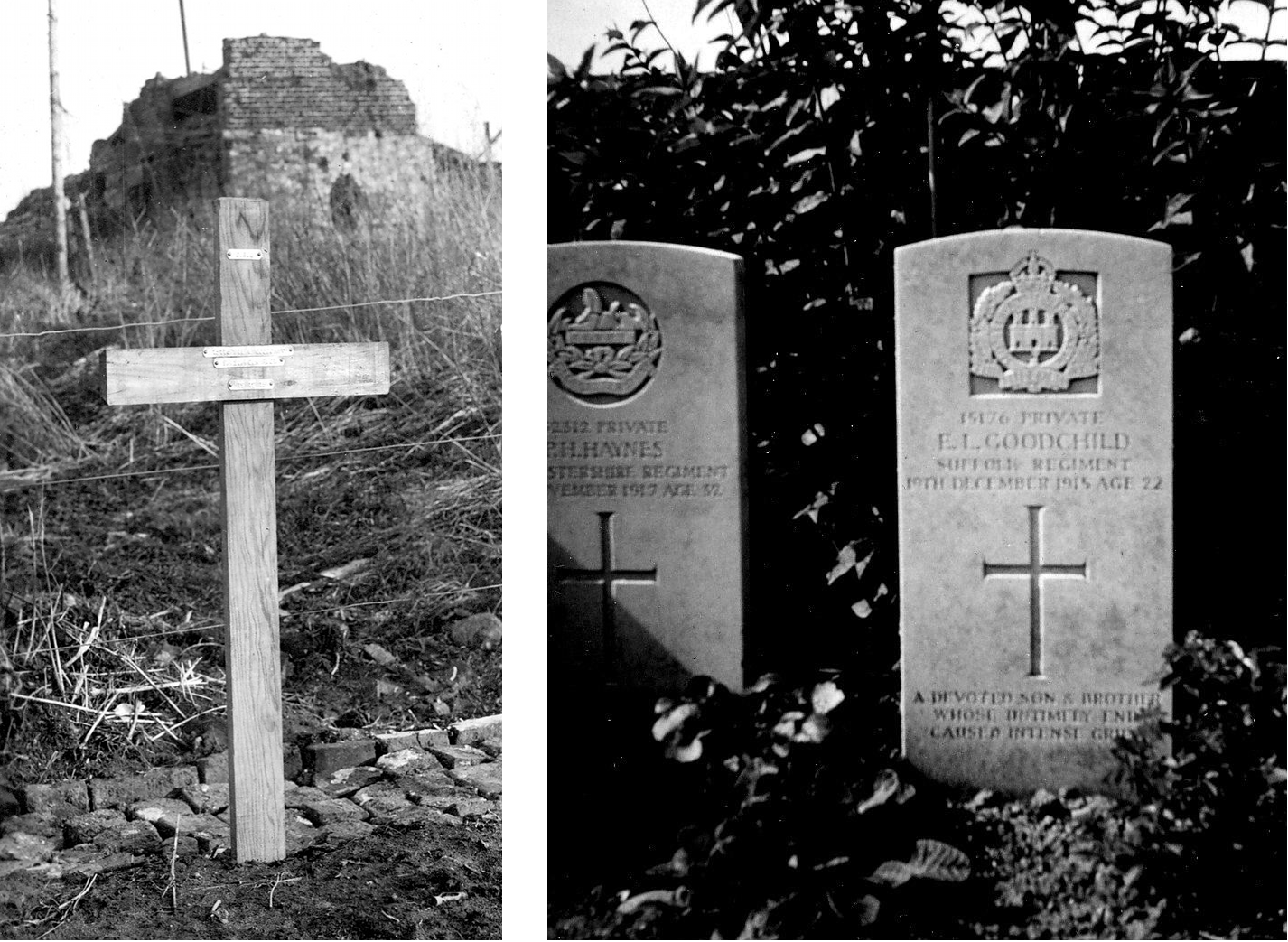 In July 1922 the IWGC wrote to Ned’s mother to say that by agreement with the governments of France and Belgium bodies buried in small cemeteries were being concentrated in larger cemeteries, and thus it had been found necessary to remove the bodies buried in the Cottage Garden for re-interment in White House Cemetery in St Jean. However, “I very much regret to say that when this work was undertaken it was not possible to identify the actual grave of the late Private Goodchild. I would point out that, as you will readily understand in many areas which have been under constant shell fire, the whole surface of the ground has been so completely altered, that landmarks and grave registration marks have been obliterated”. In place of individual graves it was intended to erect a special memorial cross at White House Cemetery bearing the names of Ned and nine other soldiers (in March 1925 the IWGC sent a list of their names) whose graves at Cottage Garden Cemetery had been destroyed during the war. However, this plan was abandoned and an individual gravestone commemorating Ned was erected. The registry for the cemetery which lists those who are buried or commemorated here states that Ned “died of wounds”, which is certainly incorrect. The gravestone itself bears the inscription “a devoted son & brother whose untimely end caused immense grief”. Six other members of the 9th Battalion Suffolk Regiment who were killed on 19 December 1915 are also buried here.