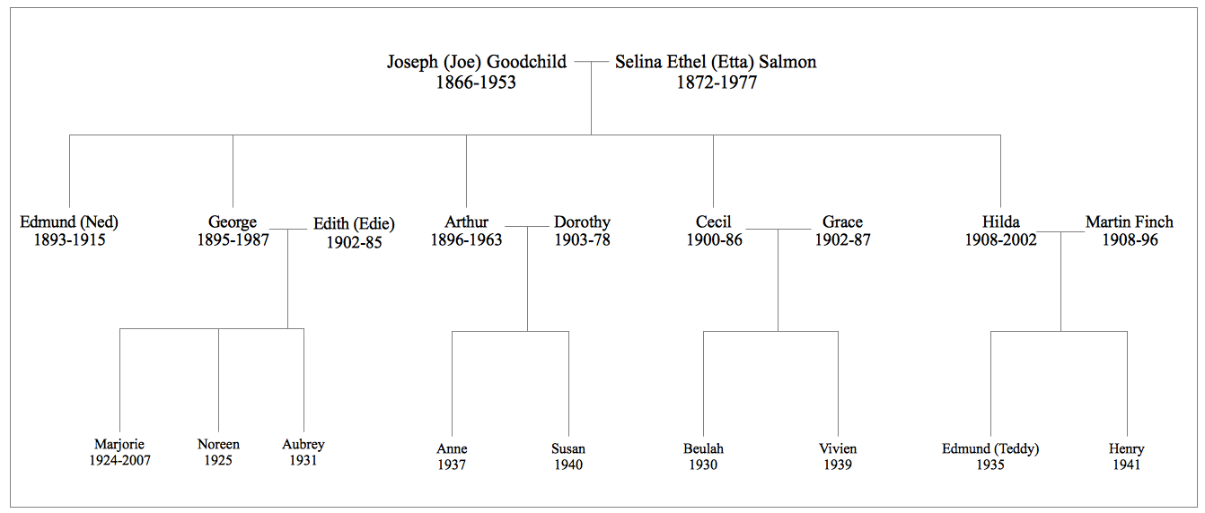 Joe and Etta were married at Capel St Mary on 5 June 1892, and celebrated their Golden Wedding on Whit-Monday 25 May 1942 at The Fens. Standing: Marjorie, Beulah, George, Arthur, Cecil, Noreen, Aubrey; Seated: Edie, Hilda with Henry, Joe, Etta, Dorothy, Grace; In front: Anne, Teddy, Susan and Vivien. Absent was Hilda’s husband Martin on duty with the Royal Observer Corps in Bury St Edmunds